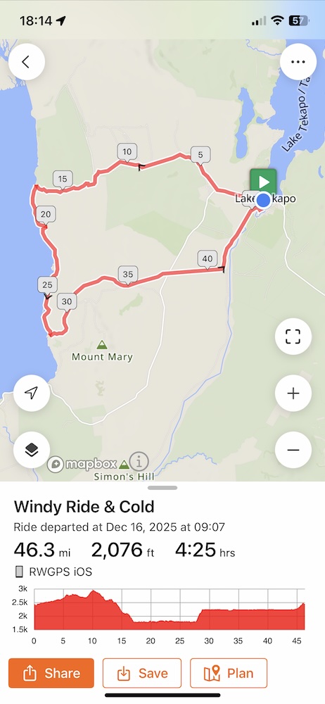 As you can see from the route profile map, there is a pretty good descent down to the shore of Lake Pukaki which I had to pedal down all the way! At one point on the descent it felt like the wind was in a tug of war battle with gravity, and wind was winning! If I stopped pedaling, the bike would have stopped and I was on a -5% downhill gradient.