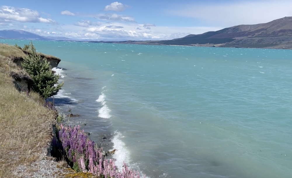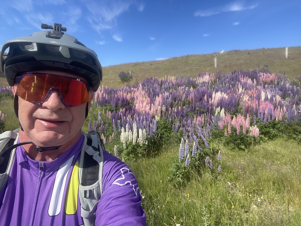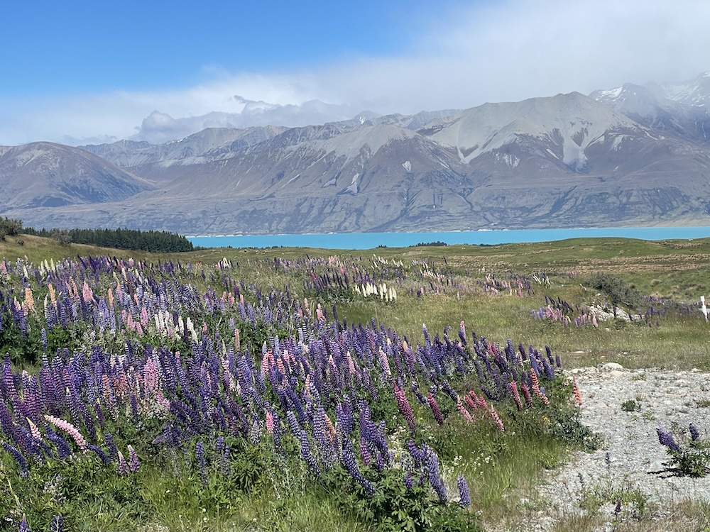 Ok, so back to the ride. The plan was to head west to Lake Pukaki over the big hill, ride the lake shore then loop back over the hill and follow the canal back to Tekapo. I knew it was going to be cold when I set out but what I had not fully factored in was the wind! It was strong, cold, and gusty. You have to ride the main road out of town for the first few miles, and there is no cycle lane. Once you turn off on the gravel road that heads in a north westerly direction you are alone. Occasionally, a work truck or a tourist van would come by but mostly I had the road to myself. There were a lot of lupins (bluebonnets) everywhere on these backroads.