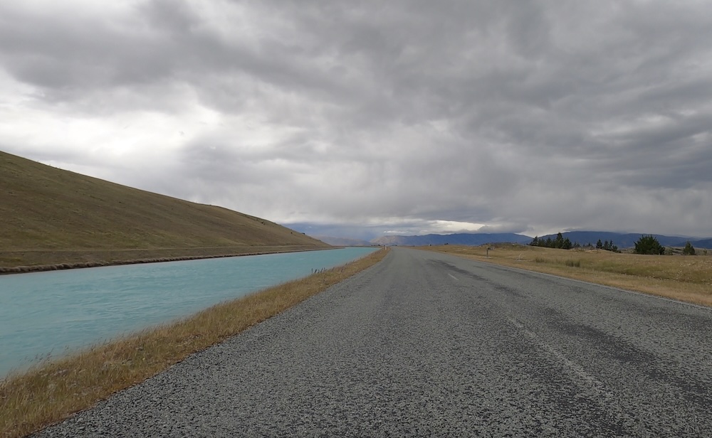 At the top of the hill there was a man made lake feeding water to the power station at the lake’s edge. The hilltop lake in turn was fed by a man made canal that stretched all the way back to Lake Tekapo and another Hydro Station A. It turned out that the trail follows the canal all the way back to Tekapo, and it was windy all the way back with a strong northerly wind hitting me at 90 degrees. Once again the bike was hard to control and I was blown off the trail twice on the journey back to Tekapo.