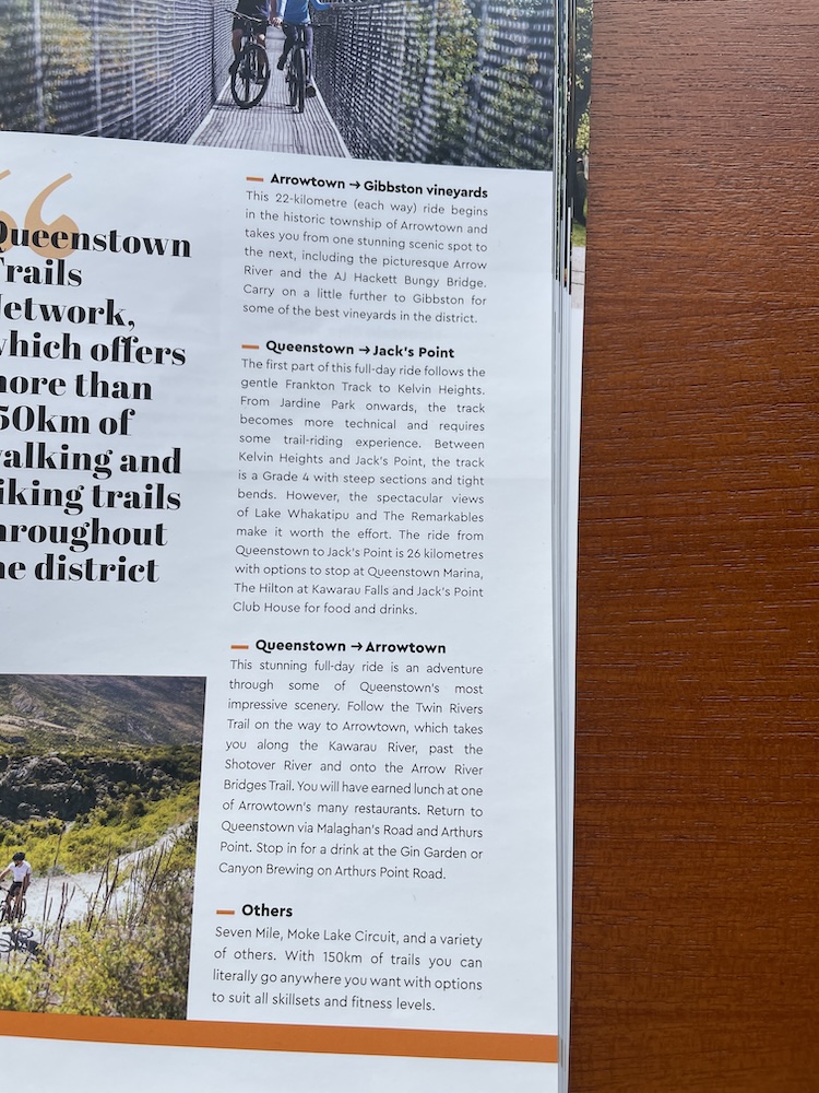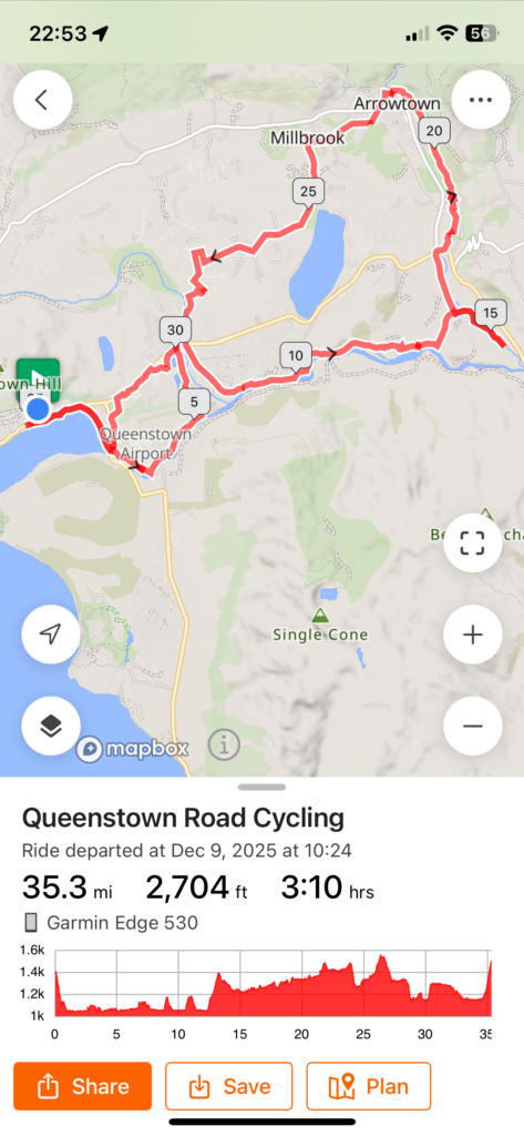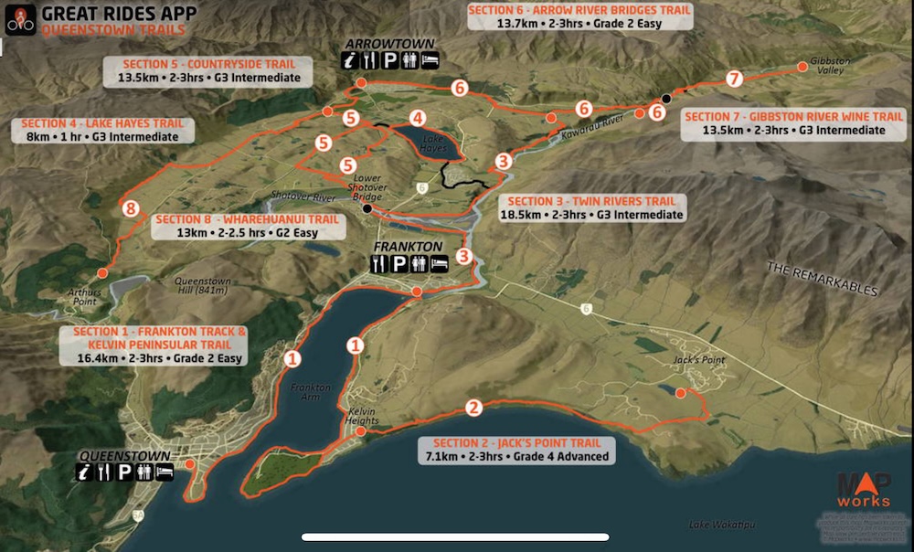 Today is my first ride in the Queenstown area, it’s Tuesday and I decided to string a few of the trail sections together to form a longer ride. There is a good iPhone app called Great Rides NZ that allows you to take the content offline in case there is no cell service out on the ride. See https://www.greatridesapp.com/ for the details. Here is the map that the app shows when you ask about the Queenstown Trails…