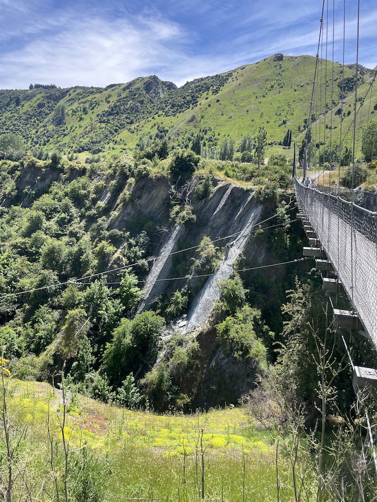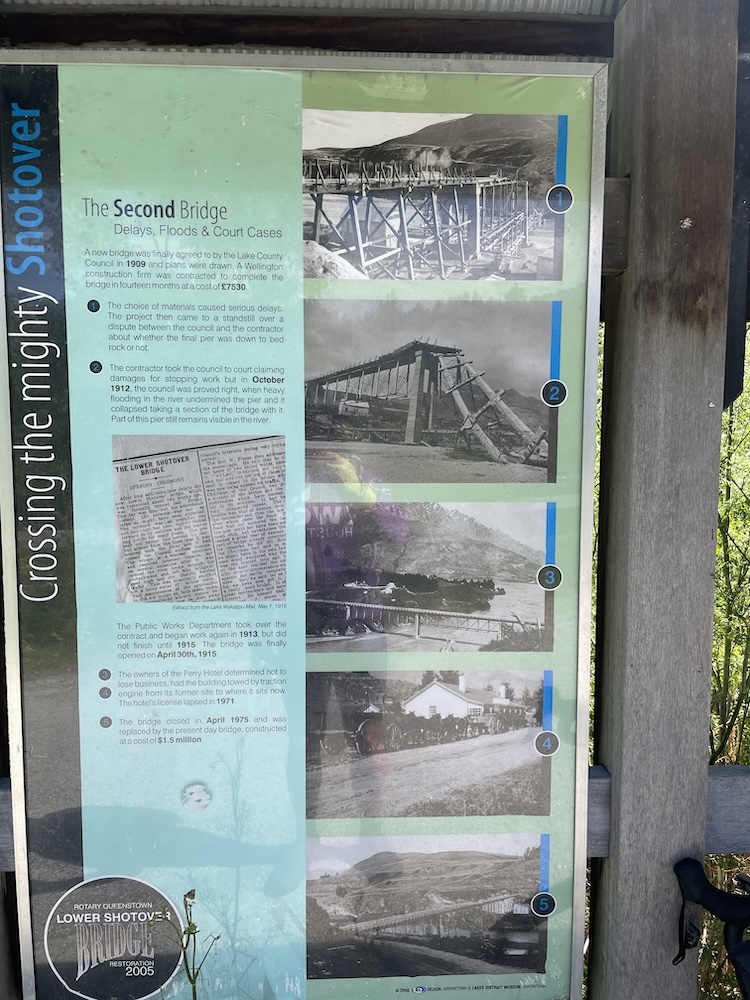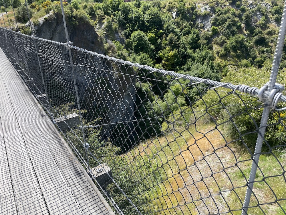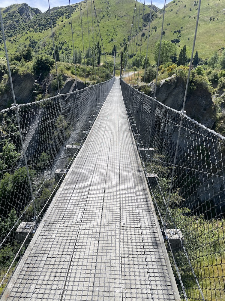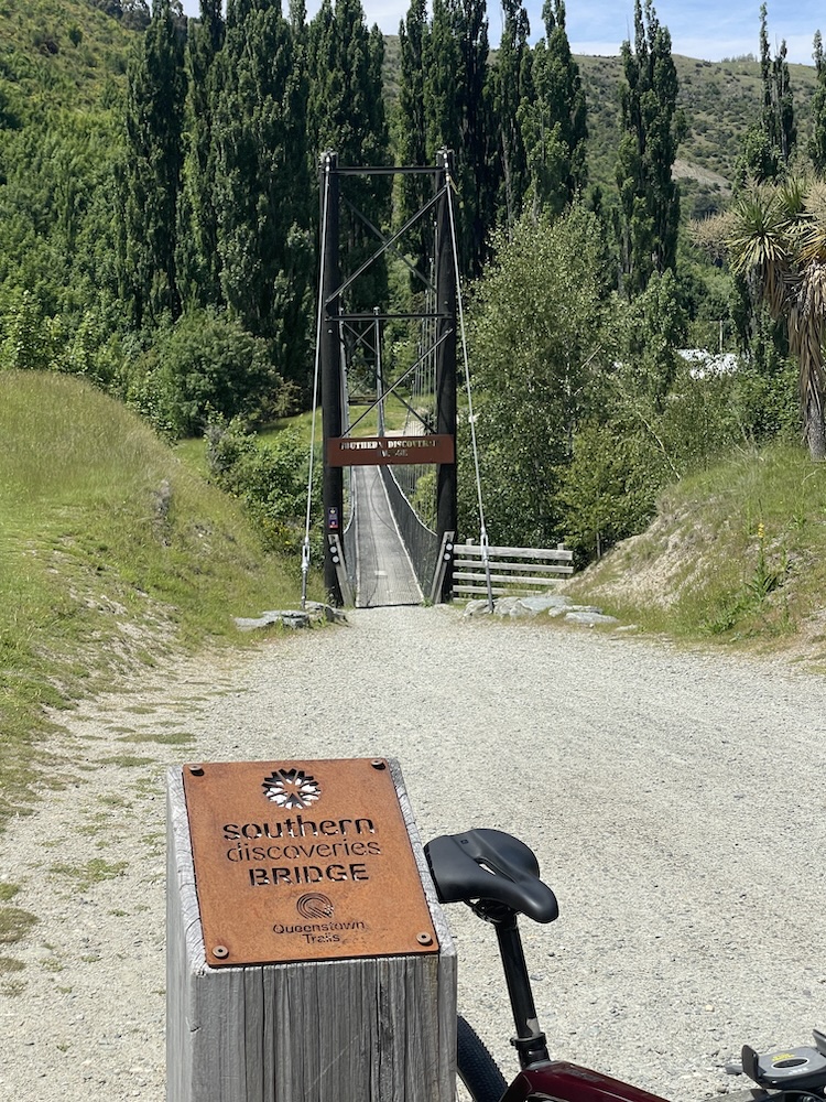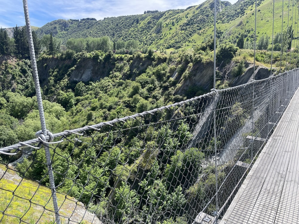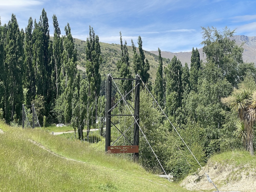 Section 1 crosses the Shotover river (above) which is used by the jet boats to give tourists a thrill ride, and as you join section 3 it follows the Kawarau river and its a scenic journey through shade trees and has a flowing MTB trail feel to it. Generally flat untii you approach the last part of section 3 then you start the climb. The river is at 1000 ft above sea level and you climb 400 ft before turning onto section 6. Then starts the gradual climb, and 15 miles into the ride you meet a scary bridge. New Zealand has many of these wire and wood suspension bridges, most being single track so you may have to wait to cross. They are normally limited to 20 people on the bridge at a time, and do move with your weight and in the higher wind gusts. When approaching from below you don’t see the wires at first and it looks like someone has suspended planks of wood across a chasm, as if by magic… there are no sides! When you reach the entrance to the bridge and take your first steps it’s a bit unnerving that the chain link fence sides let you see all the way down, that and the fact the the bridge is wide enough for 1 bike makes you feel a bit like a tight-rope walker! So my first time… I watched people cross in perfect safety, a few commenting that they were “concerned” then I reasoned with myself… I don’t think I have time to cross and ride all the way to Gibbston Wineries and that I “should” turn back and proceed to the historic town of Arrowtown for lunch. Yes, I was glad I had options this day as that bridge crossing looked scary 🙂