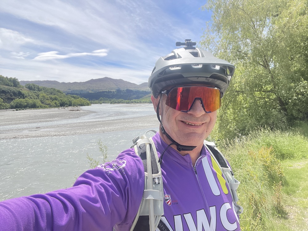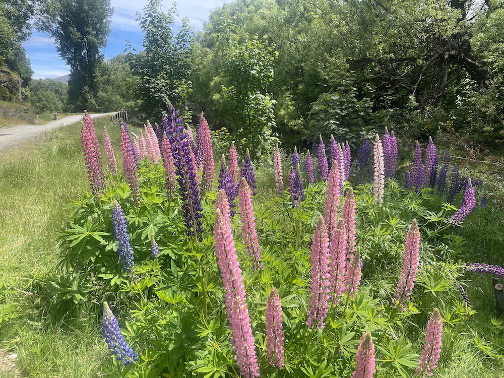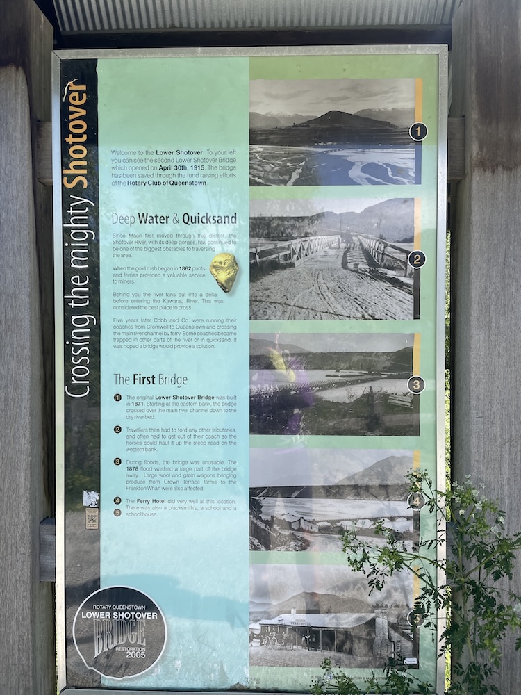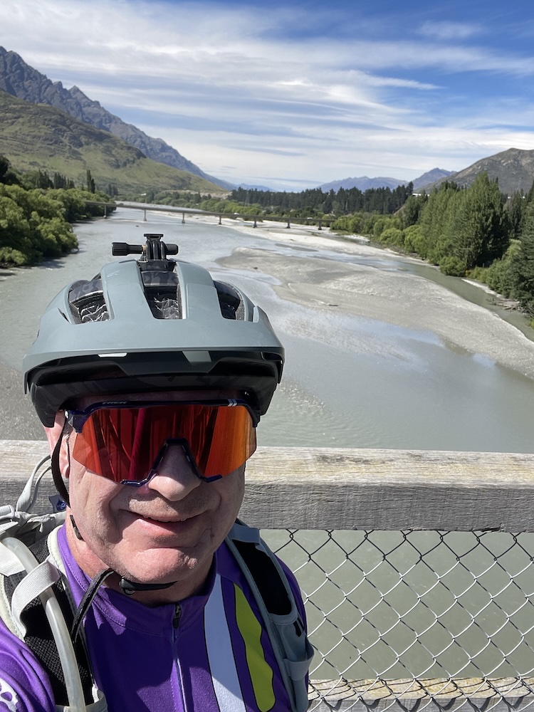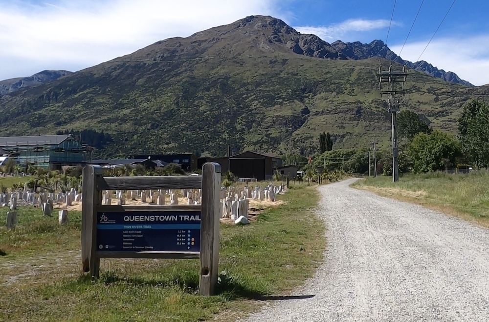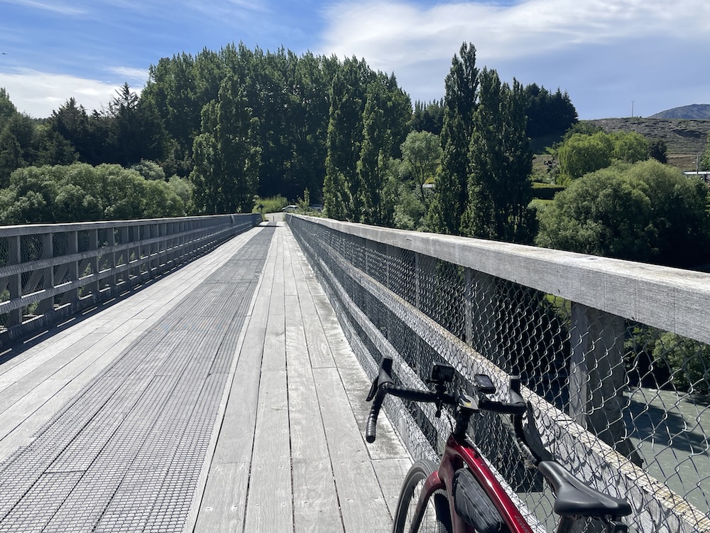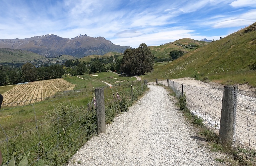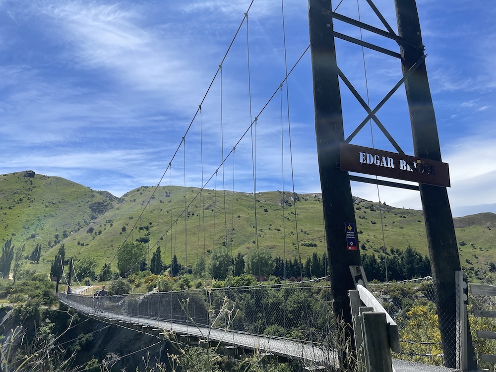 Section 1 crosses the Shotover river (above) which is used by the jet boats to give tourists a thrill ride, and as you join section 3 it follows the Kawarau river and its a scenic journey through shade trees and has a flowing MTB trail feel to it. Generally flat untii you approach the last part of section 3 then you start the climb. The river is at 1000 ft above sea level and you climb 400 ft before turning onto section 6. Then starts the gradual climb, and 15 miles into the ride you meet a scary bridge. New Zealand has many of these wire and wood suspension bridges, most being single track so you may have to wait to cross. They are normally limited to 20 people on the bridge at a time, and do move with your weight and in the higher wind gusts. When approaching from below you don’t see the wires at first and it looks like someone has suspended planks of wood across a chasm, as if by magic… there are no sides! When you reach the entrance to the bridge and take your first steps it’s a bit unnerving that the chain link fence sides let you see all the way down, that and the fact the the bridge is wide enough for 1 bike makes you feel a bit like a tight-rope walker! So my first time… I watched people cross in perfect safety, a few commenting that they were “concerned” then I reasoned with myself… I don’t think I have time to cross and ride all the way to Gibbston Wineries and that I “should” turn back and proceed to the historic town of Arrowtown for lunch. Yes, I was glad I had options this day as that bridge crossing looked scary 🙂